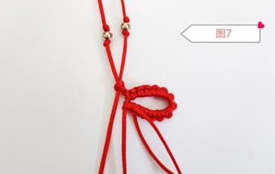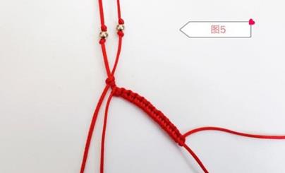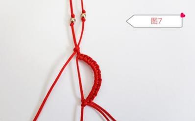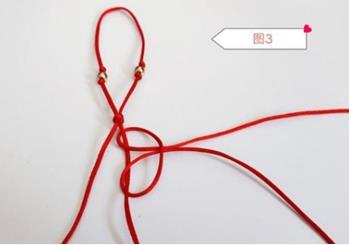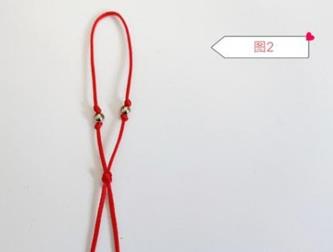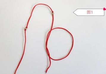 第一步,取一根红线对折然后穿上两颗珠子,打一个半结,如图1所示。